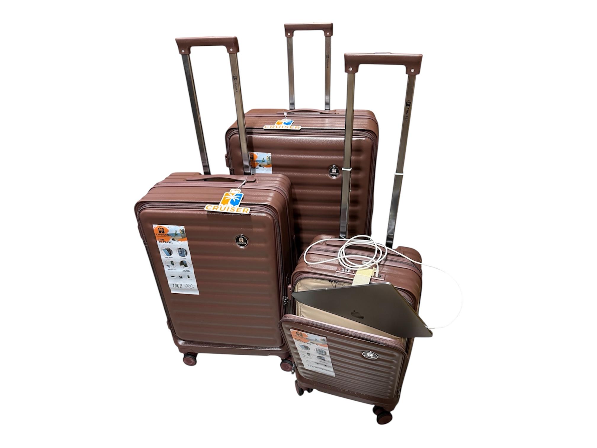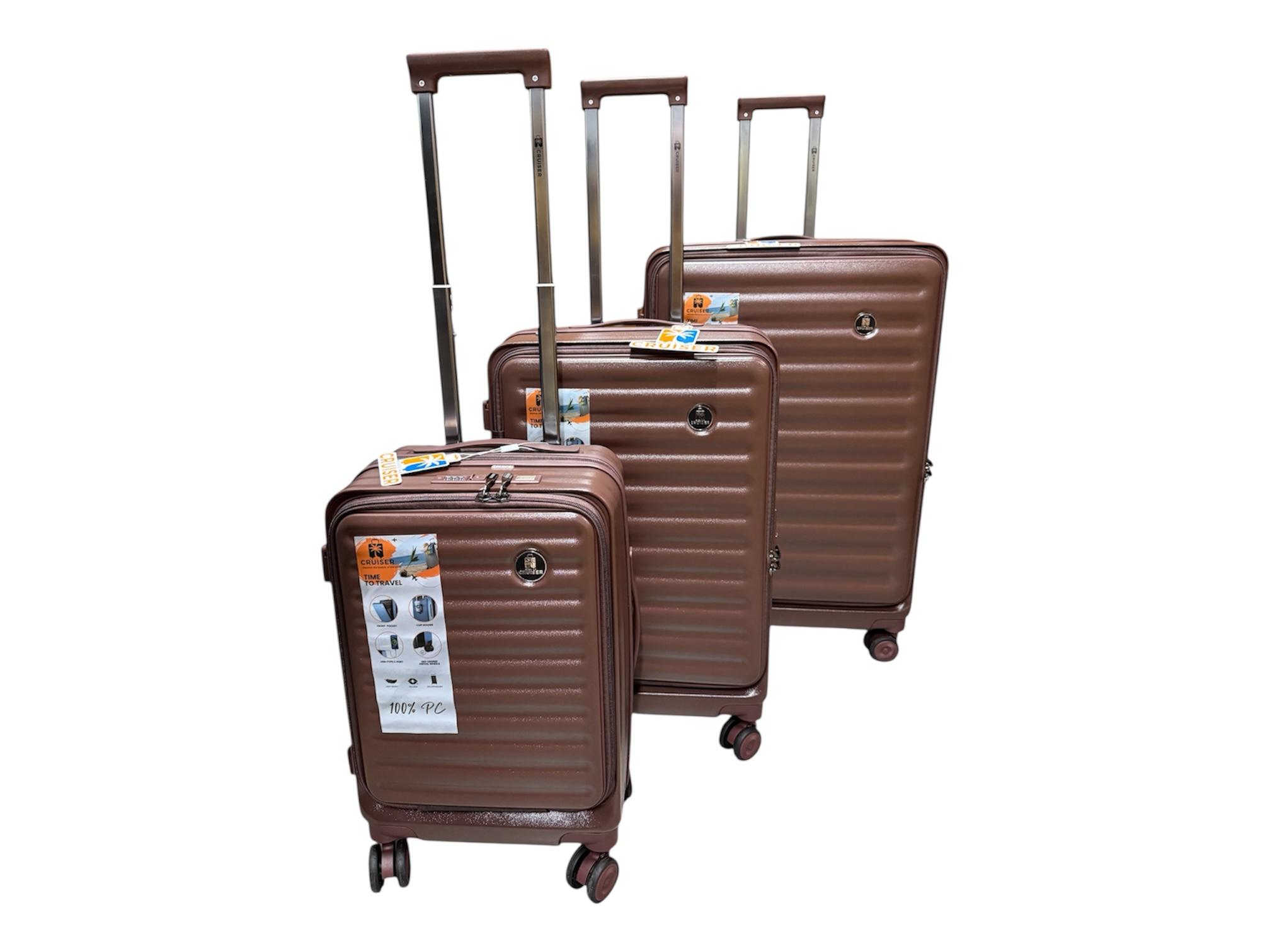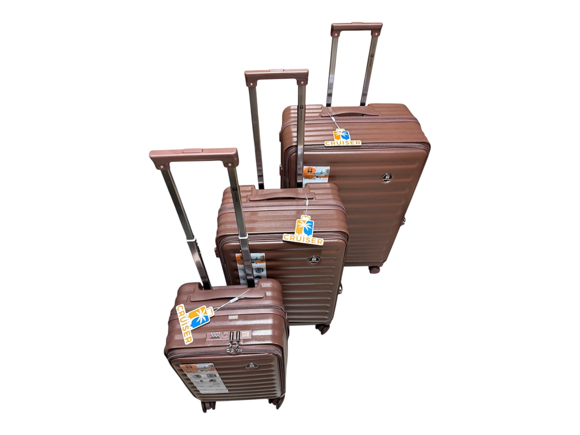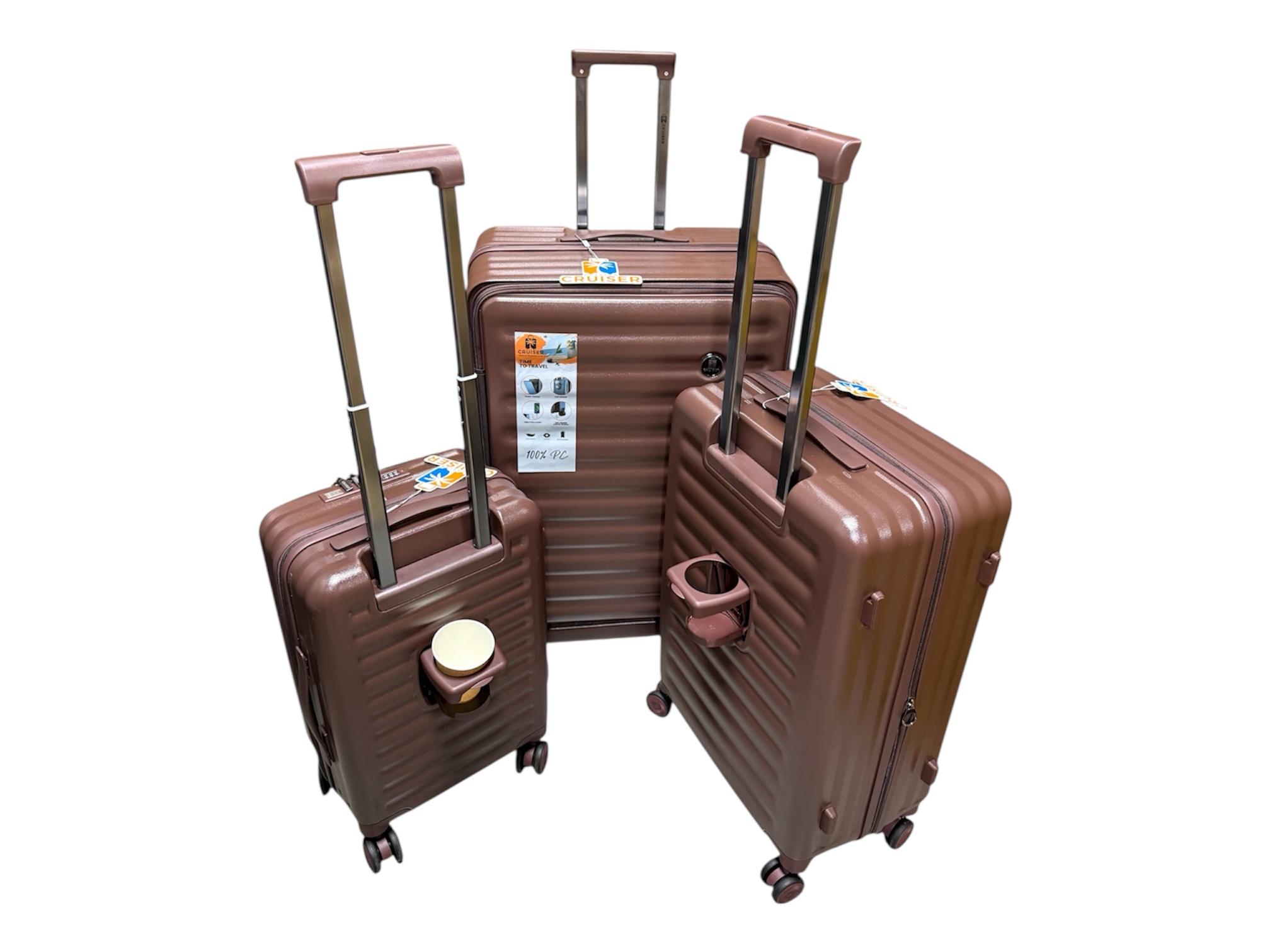Чемоданы CRUISER RUSSIAN сделаны из высококачественного 100% поликарбоната с увеличением объёма на 20% , держатель стакана , USB-Type C выход , телескопическая ручка , на четырех двойные бесшумных вращающиеся колёсах, молния антивор. размеры L,M,S (79cmx52cmx32cm),(67cmx43cmx27cm),(55cmx35cmx24)